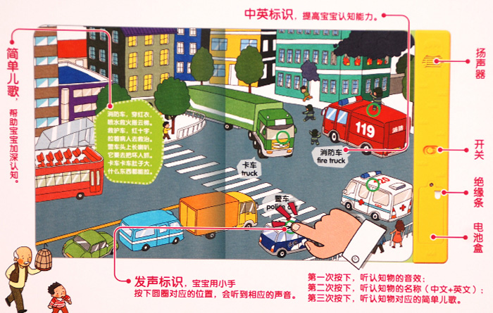 这两本书均为低幼认知书,教宝宝认知动物和交通工具。每一个跨页均为场景图,每一个跨页右页为认知物,宝宝用小手按下相应的发声位置,会发出音效、中英文朗读和儿歌,最后一个跨页为这本书认知动物或交通工具的大集合,培养宝宝认知能力和动手能力。