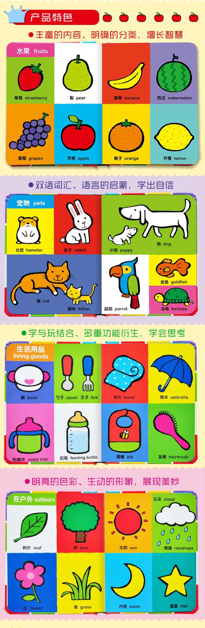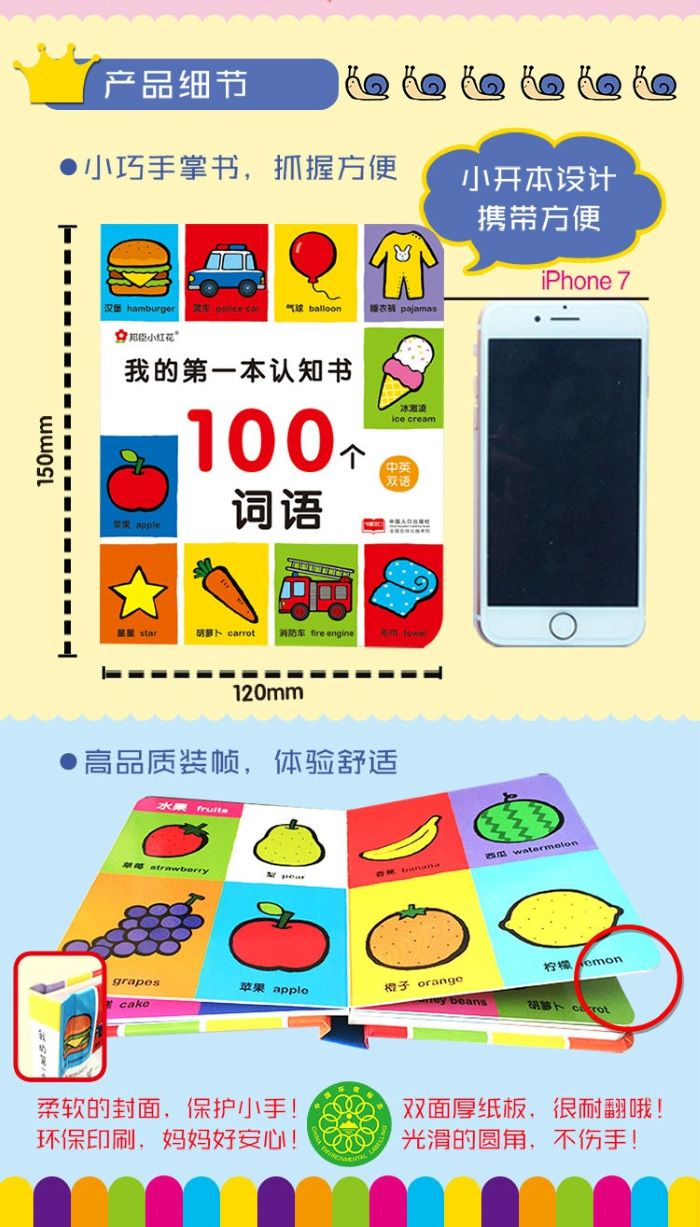 《我的第一本认知书》包括100个词语、100个动物、数字/颜色/形状共3册。一套精心打造的双语启蒙认知书,让牙牙学语的宝宝学习基本词汇;一幅幅色彩亮丽的图片,激发宝宝认读的兴趣;柔软的圆角封面,保护宝宝小手;厚实的硬纸板,让宝宝反复翻阅;小开本手掌书,抓握方便,是宝宝的第一本必选书。