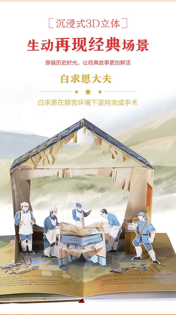 本册《白求恩大夫》讲述了白求恩千里迢迢从加拿大来到延安,为中国抗日战争做出重要贡献的故事。 白求恩有着坚定的共产主义信念,他义无反顾冲上前线,用精湛的医术救治无数前线战士;他帮助中国人民建造战地医院,大大提高了我党当时的医疗水平;他与战地军民共进退,用热忱的敬业精神鼓舞所有人奋勇向前。故事将这些感人事迹,通过插画、文字和纸艺等进行全方位、多角度地呈现,让孩子在新颖的阅读形式中感受革命先辈的永恒魅力和不朽力量。