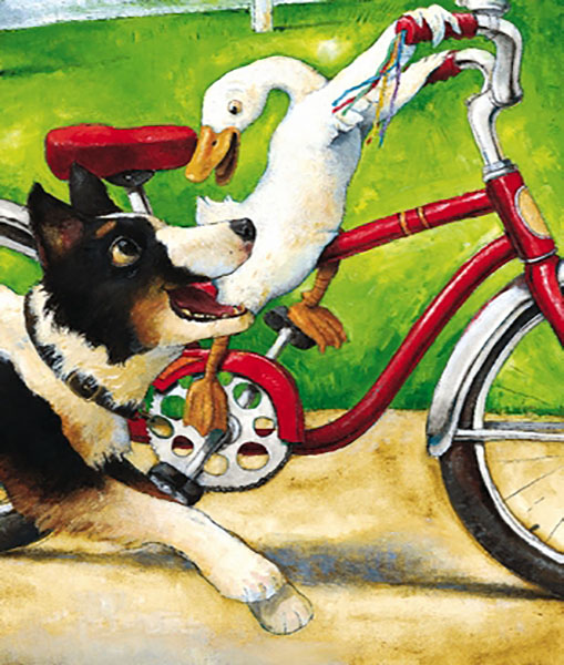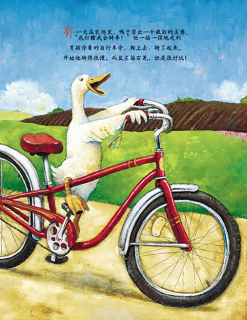 鸭子骑车?这可真是个疯狂的想法!但有一只鸭子真的办到了!农场里的马、牛、羊、鸡、狗、老鼠……对鸭子骑车这件事有什么看法呢?在一个平平常常的下午,动物们干了一件很不平凡的事情……作者通过这个让人兴奋又愉悦的故事,生动地描绘出孩子勇于探险的心理特征,让孩子读后产生极大的满足感。书中各种动物的语言和表情都十分传神,和孩子一起朗读,会让孩子兴致勃勃地融入其中。而大胆的笔触和鲜艳的色彩,既吸引孩子的目光,更深入孩子的心灵,让他们萌发大胆尝试的勇气。