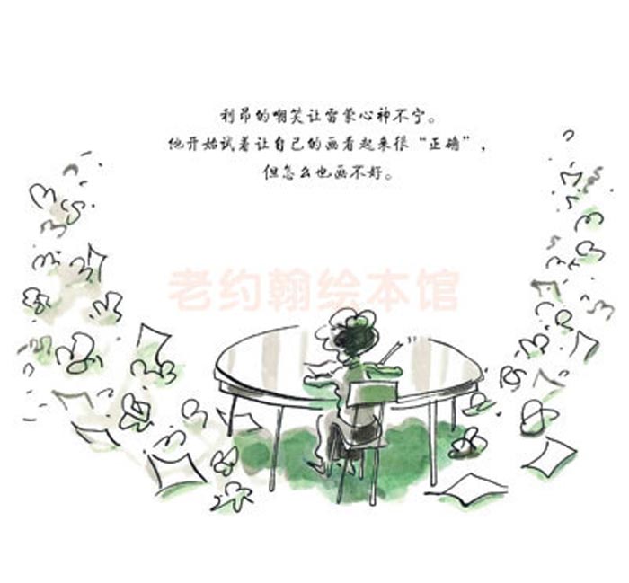 儿子眼睛瞪得大大的,我以为他对我的说教大彻大悟的信服了,谁知他象有新发现似的说:妈妈,就像《味儿》里说的。说着从床上迅速滑下来,刀书架上抽出《味儿》这本书。他给我翻看着说:哥哥嘲笑雷蒙画得不好,他心神不宁?怎么也画不好了,就不画了。可是妹妹说他的画有味儿,贴墙上了。雷蒙说自己画的那瓶花一点都不像,妹妹说:不过,他看起来很有花瓶味儿。雷蒙走近看了看,然后,他仔细研究其房间里自己的画,忽然发现了一种全新的视角。“它们看起来的确很有——味儿。”雷蒙说。雷蒙觉得轻松、充满干劲儿。一想到“味儿”,他的创意就自然的流淌出来。他开始按照自己的感觉画画,没有任何顾虑。那些自由自在的线条,就像泉水一样源源不断地涌出来。雷蒙又开始不停地化他身边的世界了。创作有“味儿”的图画,感觉真是棒极了。……从此以后雷蒙过上了一种有?味儿”的生活。