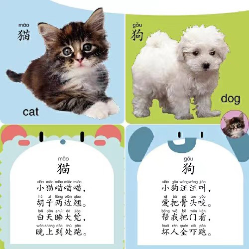 本书共8张16页,每一页有四个格子,上面两个格子占两种孩子喜欢的小动物图片,下面两个格子占对应的2首儿歌,共32种动物和32首儿歌。每一页的内容包括对应的汉字和拼音、对应的英文单词、动物的图片和有趣的儿歌。孩子们从小就喜欢小动物,对她们来说小动物就是一位好朋友,所以这本卡片可以更好的帮助它们了解和认识小动物,学习新知识。