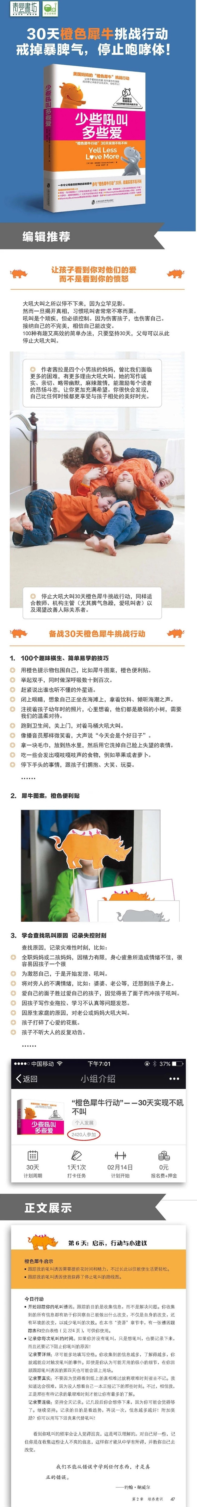2012年1月,作者家的帮工偶然碰见她正在冲着孩子们吼叫,她这才意识到自己已经非常习惯冲孩子大喊大叫,并且丝毫没意识到孩子们如何看待自己,更没想到吼叫对孩子们造成了怎样的影响和伤害。于是从这天开始,她发誓要彻底消除这个习惯。她开始了“橙色犀牛挑战”,公开承诺,自己在随后的365天里将不吼不叫。她成功地超额实现了自己的目标。她的成功源于找到了一种有趣、而又有创造性的方式来解决那些不那么有趣的问题。她的博客日志记录了自己的经过,重点记录了自己的教训和替代吼叫的各种方法。她的写作诚实、亲切、略带幽默而又有激励性。她的博客成了渴望停止吼叫的父母们和其他人的一个论坛。博客获得了育儿杂志评选的2013年最有用的博客的称号,并曾经被《赫芬顿邮报》和世界上其它的育儿方面的博客无数次地转载过。