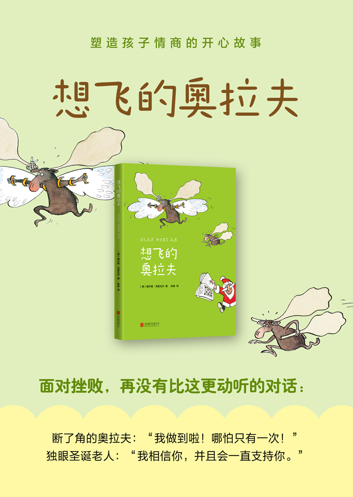 《想飞的奥拉夫》讲述了发生在断了角的*奥拉夫和独眼圣诞老人之间的开心故事:一只*想要飞翔?别逗了!就算你的角长得像滑翔翼那么大也不行,更别说有一只还断了!然而,奥拉夫却执意坚持,设计翅膀、改进翅膀,坚持练习,哪怕摔得鼻青脸肿、付出血的代价也无所谓。在一次紧急情势下,奥拉夫成功飞跃了壮阔的熊谷,可惜没人看见,也没人相信,就连圣诞老人也认为他在吹牛。于是,奥拉夫决定再飞一次。