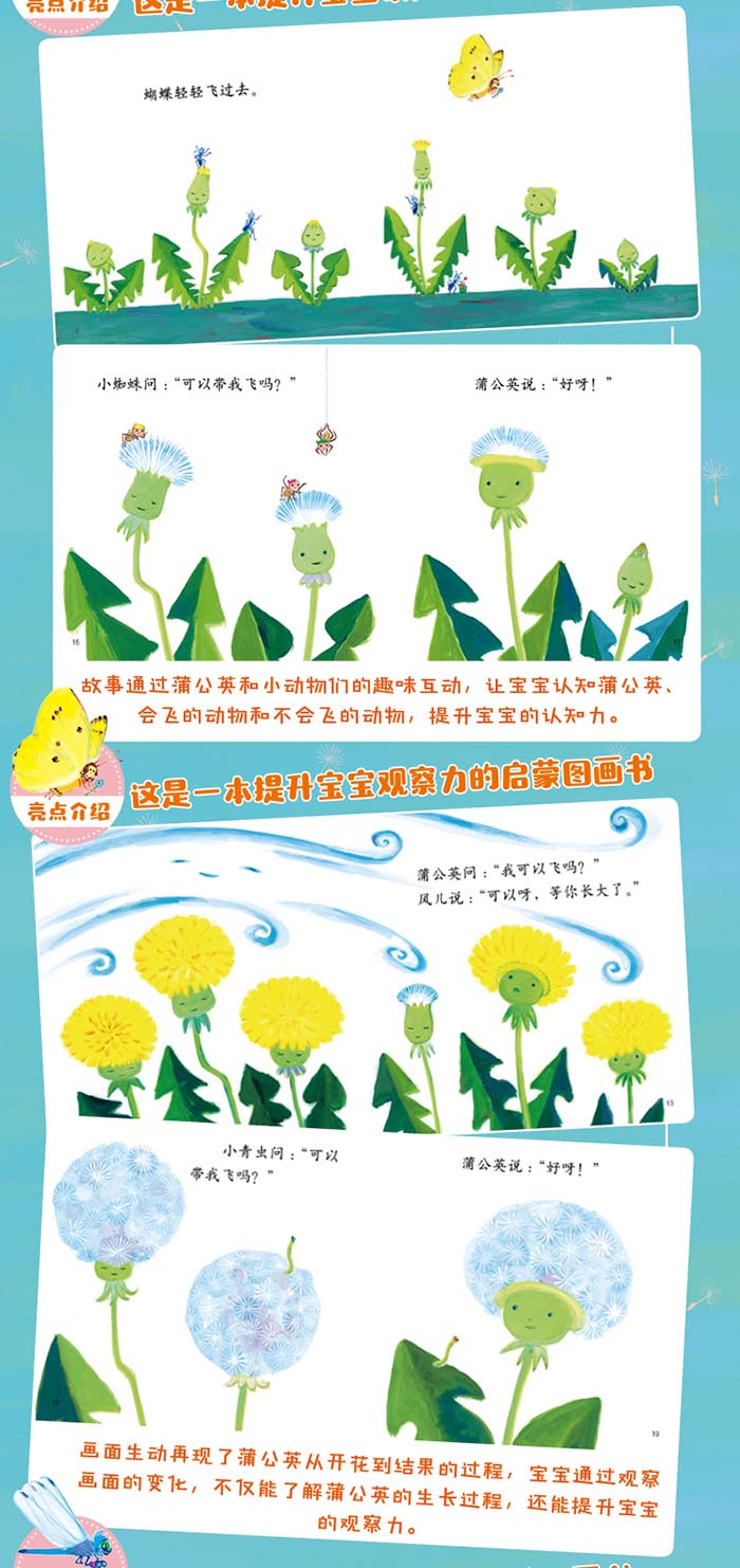这本书是“中少阳光图书馆·乐悠悠启蒙图画书”系列中的一本。小青虫、小蚂蚁和蒲公英看见会飞的蝴蝶和蜜蜂很羡慕,也想飞起来。风爷爷告诉蒲公英,等他长大以后,他就能飞起来了。于是,蒲公英便一心盼着自己赶紧长大。终于,长大后的蒲公英带着小青虫和小蚂蚁一起飞上了天空……故事通过认知蒲公英的生长过程和可爱的小动物们,让宝宝感受浓浓的友情。