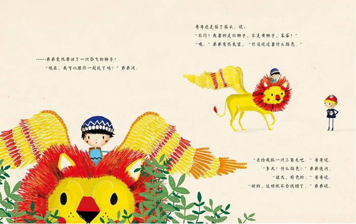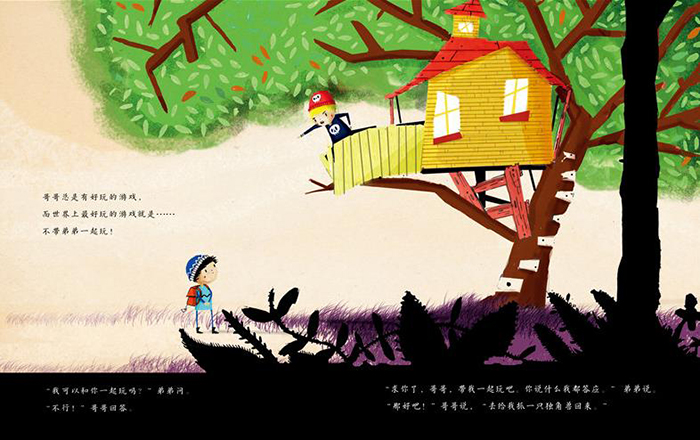 哥哥的树屋是彩色的、充满吸引力的,哥哥的拒绝是黑色的、令人心碎的,然而弟弟的冒险是五彩缤纷、神秘莫测的,弟弟*后收获的世界是五彩斑斓、令人向往的。*后继续陪弟弟玩的,都是弟弟千辛万苦找来的“怪物”,它们不就是伴着我们成长、不断前行的“经历”吗?