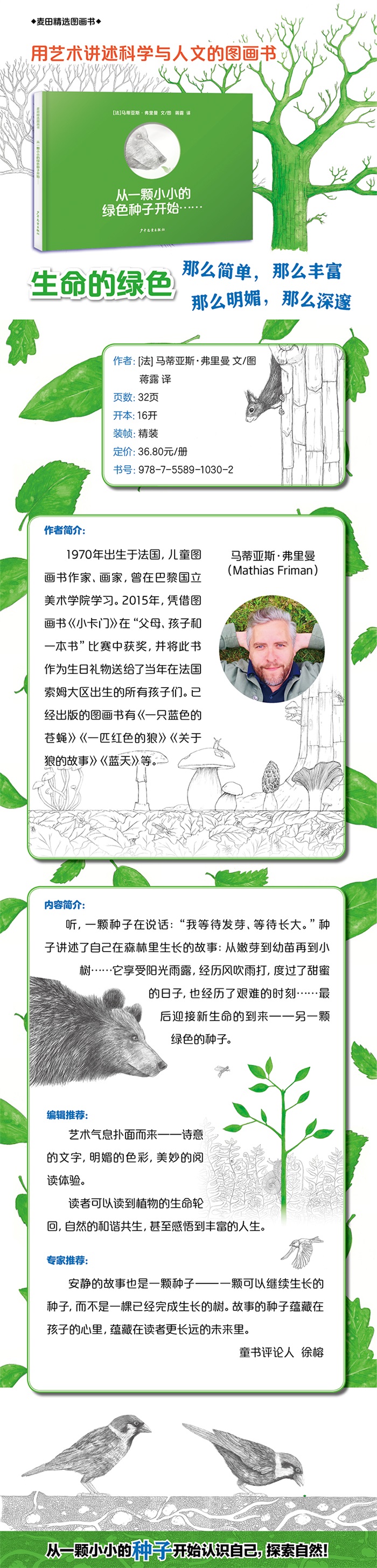 这是一本艺术性很强的图画书,全书只有鲜明的荧光绿色与朴素的黑色线条搭配呼应,具有视觉冲击力,能让读者一下子抓住图画的视觉中心,理解叙述者身份;作为图画背景的黑白线条画,细节丰富,能引发读者去发现文字之外的更多故事。全书以一颗绿色小种子的口吻讲述了它长成一棵大树的“人生经历”,并揭示出了自然生态系统中植物、动物与环境的各种关系,以及大自然生命循环、周而复始的运行机制,将文学性与科普知识性紧密结合,同时蕴含了生活的哲思。