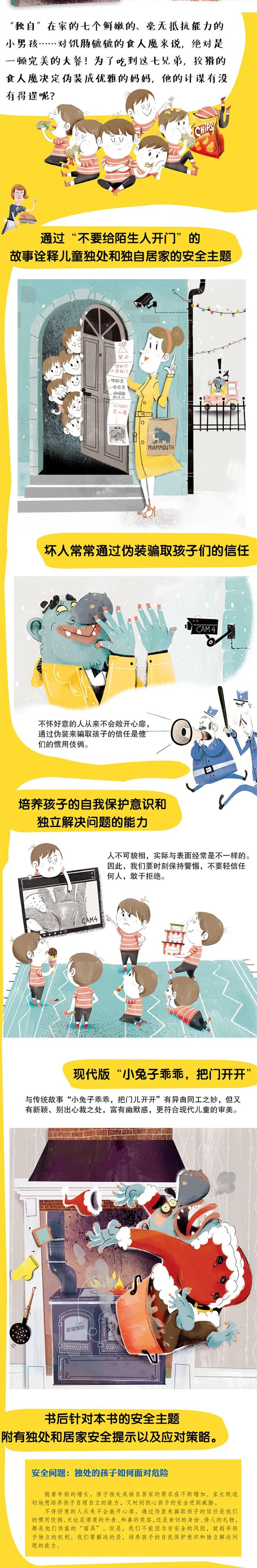 这是一本适合3-6岁儿童阅读的安全教育的图画书。 七个鲜嫩的、毫无抵抗能力的小男孩……对饥肠辘辘的食人魔来说,绝对是一顿完美的大餐!但是,要想吃到这七兄弟,食人魔可得费些脑筋。因为七兄弟的妈妈在出门采购前,特意嘱咐过孩子们不要给任何人开门。可是如果狡猾的食人魔伪装成优雅的妈妈,会发生什么事情呢?食人魔的计谋有没有得逞呢?故事既令人捧腹,又值得深思。 本书用独特而幽默的方式重新演绎了著名的《狼和七只小羊》的故事。警示孩子,独自居家时不能给陌生人开门,有效增强孩子的自我保护意识。