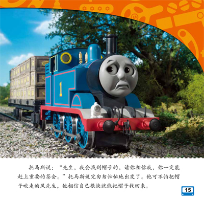 《不好!帽子飞走了》托马斯与史宾塞比赛赛跑,他们使劲儿地跑着,当他们进站时,胖总管正站在站台上,他们紧急停车带起的风吹走了胖总管的帽子,帽子被风越吹越远,托马斯跑不过风,追不到帽子,他该怎么办?
