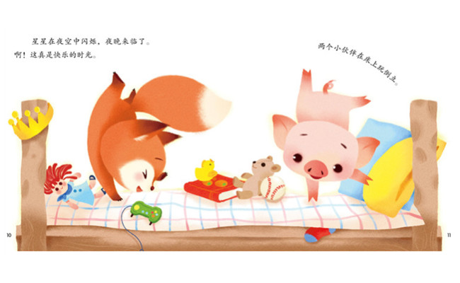 猪叔叔带着小猪来小狐狸家做客,小狐狸和小猪很快就成为了好朋友,他们玩得很开心。到了晚上,他们要睡在一起。妈妈让他们早点休息,第二天要去野餐。可是两个好朋友太兴奋,一直玩闹着,睡不着。第二天早上,妈妈喊他们起床,他们一点儿精神都没有。小狐狸更是完全变了样,他不像平常那样美美地吃东西,更不像平常那样快活地跑来跑去。这个故事告诉我们——早睡早起身体好,晚上到了点就应该按时睡觉,小朋友记得要养成按时睡觉的好习惯哟!