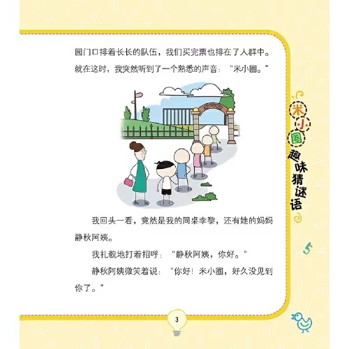 “米小圈”新系列——《米小圈趣味猜谜语》上市啦!本系列以精彩有趣的米小圈故事为主线,用答题闯关的模式,分三关展现大量谜语题,让小读者既能读到有趣的故事,又能开动脑筋猜谜语,在“沉浸式猜谜”中,开拓思维,提升阅读能力。书中的谜语不仅考虑了难度,也考虑了朗诵感,谜面读起来朗朗上口,让读者由眼及耳去体会中文的简练与韵律。读故事,智闯关,快来和米小圈一起猜谜语吧! 《动物园大闯关》: 周末,米小圈和李黎来到动物园玩,恰巧,园内正举办“动物园大闯关”活动,本次活动主题为“西游记”,如果闯关成功,便可获得一件神秘大礼。跟着米小圈一起去闯关吧!