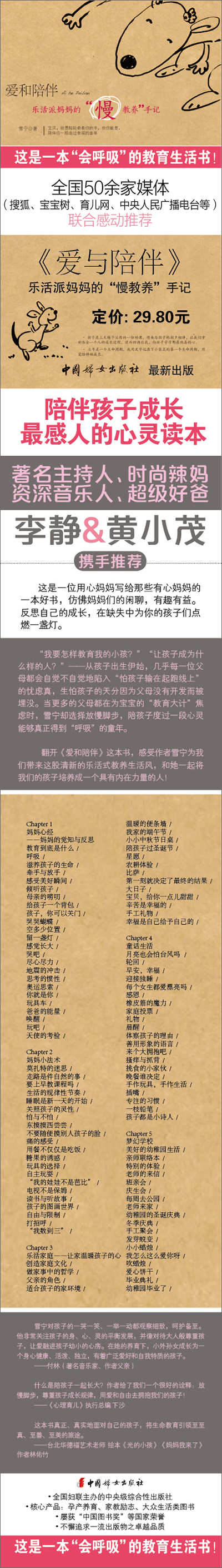 著名主持人、时尚辣妈李静&资深音乐人、温情老爸黄小茂 隆重推荐一本“会呼吸”的教育生活书!阅读这本书,让你的孩子成为一个具有内在力量的人这是一位用心妈妈写给那些有心妈妈的一本好书。仿佛妈妈们的闲聊,有趣有益。反思自己的成长,在缺失中为你的孩子们点燃一盏灯。 ——著名主持人李静、资深音乐人黄小茂夫妇雪宁对孩子的一哭一笑、一举一动都观察细致,呵护备至。她非常关注孩子身、心、灵的平衡发展,并像对待大人般尊重孩子,让爱融进孩子幼小的心房。在她的养育下,小外孙女成长为一个身心健康、活泼、独立,有着广泛爱好和自我特质的孩子。 ——著名音乐家、作者父亲付林