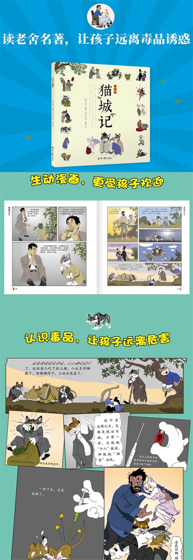 《猫城记》是海外知名度仅次于《骆驼祥子》的老舍作品,也是老舍的一部带有科幻色彩的小说。小说讲述了火星上的文明古国猫国,在毒品“迷叶”的侵蚀下*终亡国的故事。《猫城记:漫画版》将原著精编,用漫画的形式讲述出来,更适合孩子阅读。此外,《猫城记:漫画版》对原著的后半段进行了改编,更加突出毒品的危害性,对小读者有很好的禁毒教育意义。