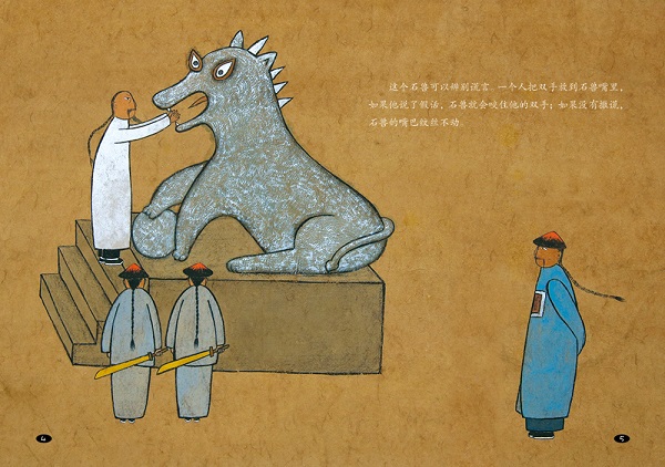 本书是故事绘本,内容改写自民间故事,配上精美插图。本书讲述一只石兽断案故事。石兽可以分辨世人的谎言,只要把双手放到石兽嘴巴里,如果有人说了假话,石兽就会咬他的手;如果没有撒谎,石兽的嘴巴纹丝不动。一个贪财的人对朋友不忠却想办法企图欺骗石兽,但最终被识破,受到惩罚。这是一个关于公正与谎言的故事,告诉孩子,对朋友要忠诚,不能损人利己,再完美的谎言,终将不能维持下去。