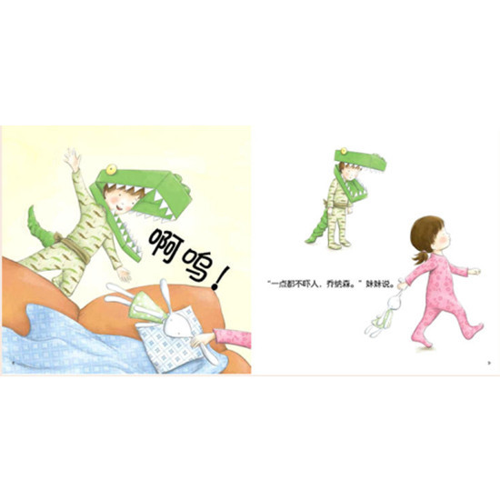 《吓一跳》是一本关于陪伴的引进绘本,故事讲述的是小男孩乔纳森喜欢吓唬家人,但是每一次都失败了,有一天,爷爷假扮恐龙,终于吓到家人了。这是一个调皮的孩子的故事,也许小朋友能在乔纳森的身上找到自己的影子,有时孩子们的恶作剧只是渴望得到大人的关注,希望有人能陪自己一起玩耍。因此当孩子像乔纳森一样想让家长“吓一跳”时,就假装被他吓到了吧,或者像爷爷那样参与进来,给予他们正确的引导和多一些陪伴。这样的亲子互动和亲子陪伴对孩子的成长中将是非常有益的。