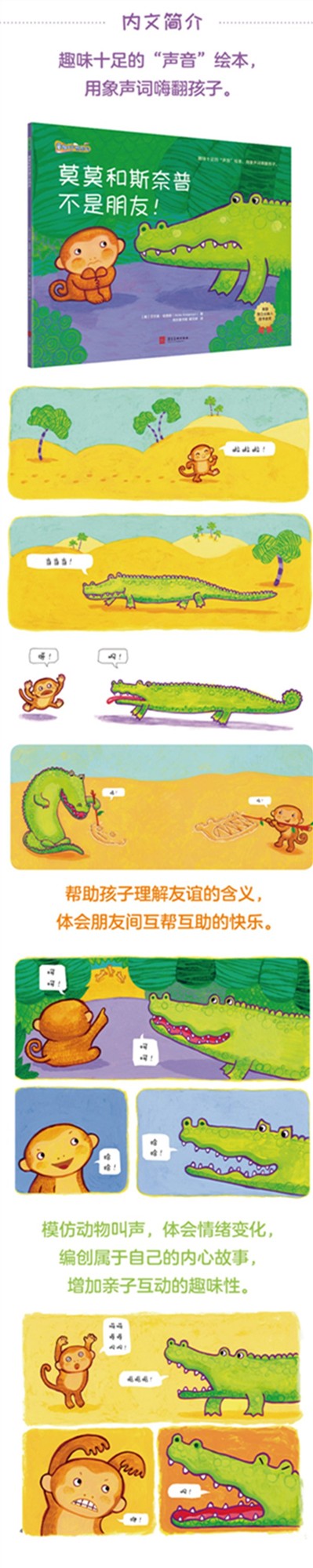 小猴莫莫和鳄鱼斯奈普相遇了,他们做鬼脸、比肌肉、比跳水……争相证明自己比对方更厉害。可是,三只饥饿的狮子突然扑奔过来!受到惊吓的莫莫和斯奈普会做出什么选择?
