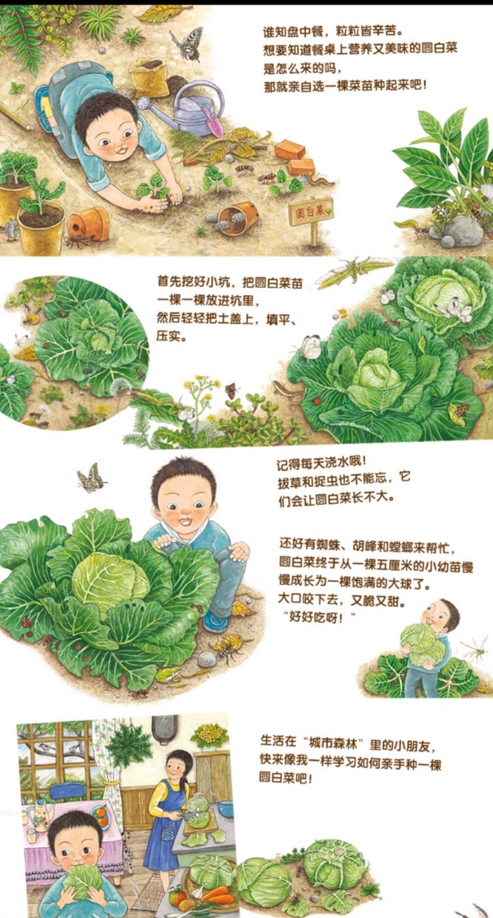第一本认识圆白菜的自然生态绘本,第一人称叙述,让小读者跟着主人公一起“种”圆白菜,观察生态、学习知识、享受故事。作者历时一年完成这本绘本,为了呈现丰富的层次,她选用国画专用的京和纸来画这本书,先以小笔勾勒轮廓,再一层层堆叠上色。同时,在书里还设计了大拉页,将圆白菜的成长过程完整呈现;在故事最后附上圆白菜和相关植物、昆虫的知识页,可以更进一步了解与认识和圆白菜相关的生态环境。