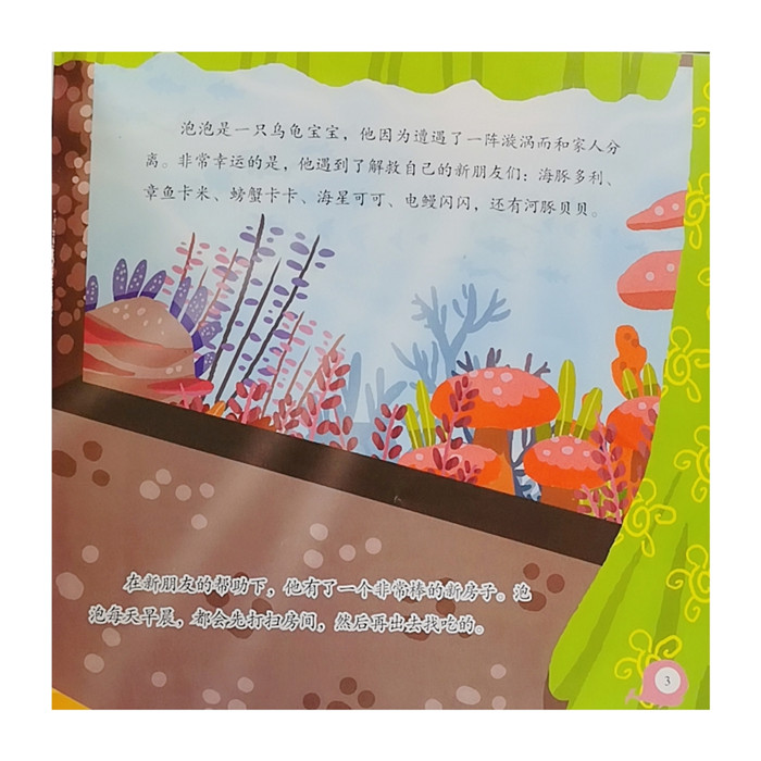 《泡泡龟海底历险记》是一套系列图书,以12个生动有趣的小故事,为孩子们呈现出一只小乌龟独自成长的经历。小鸟龟泡泡在海底游玩时,遇到了一阵旋涡后,与家人失散了。在迷途中,小鸟龟遇到了善良可爱的朋友们:多利(海豚)、贝贝(河豚)、卡卡(螃蟹)、可可(海星)、闪闪(电鰻)、卡米(章鱼),他们互相帮助,一起玩耍,一起愉快地生活。在丰富多彩的海洋世界里,孩子们可以跟随着泡泡龟的历险过程学会成长,用爱与尊重去包容和理解他人,培养良好的道德观和优秀价值观。