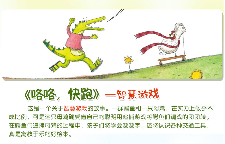一时兴起,一只鳄鱼想骑上滑板车出去溜溜,没想到滑板车被一只母鸡抢去了!于是,它集结它所有的鳄鱼同伴,不论是敌是友,向偷车贼发起了追赶行动。“追车大军”的队伍不断壮大,可是,跑步可真不是鳄鱼们的强项,一路上,大家使尽浑身解数。上天、下海,五花八门的招数都用上了。鳄鱼们骑上自行车,摩托车,拖拉机,热气球,轮船,直升机,甚至飞机一路追赶。可是*后还是让母鸡逃掉了。