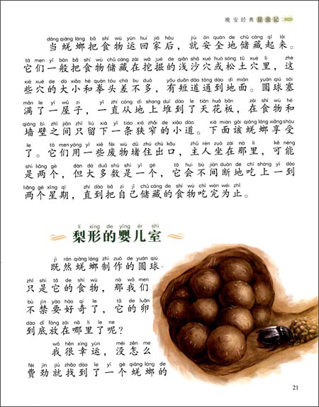会唱歌的蝉、能干的泥水匠舍腰蜂、卖力滚着粪球的蜣螂、美丽绚烂的大孔雀蛾、不停织网的圆网蛛……我们相信,你一定会被昆虫世界里这些“小家伙”的毅力所震撼,也会为它们的互助友爱所感动,更会为它们的种种绝技欢呼喝彩。精美细腻的百余幅插图、生动百趣的故事,让你在品读故事的同时轻松愉悦地走进这个美好的昆虫乐园,在得到丰富昆虫知识的同时也获得了完美的视觉享受。