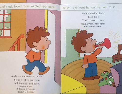 I'm- going- to- Read 分级阅读第二级Level2。中英双语,适合亲子共读或二三年级英语初学者自行阅读。Andy有一个红色的喇叭,但是家里谁也不让他吹,安迪觉得一点也不好玩,谁也听不到他的音乐,于是他来到外面吹了起来,有谁来欣赏安迪的音乐了呢?