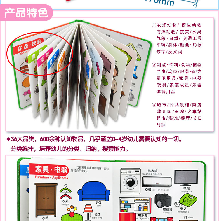 《0-4 岁幼儿启蒙认知双语小百科2》认知内容延伸到孩子生活的各个方面,包括甜点·饮料、食物、植物、昆虫、鸟类、玩具、服装·配饰、厨卫用品、家具·电器、家庭成员、乐器、体育用品等。
