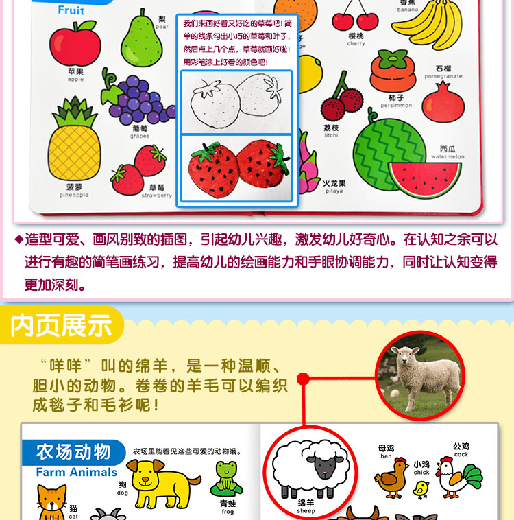 《0-4 岁幼儿启蒙认知双语小百科1》认知内容贴近孩子生活,以单个的形式出现,包括农场动物、野生动物、海洋动物、蔬菜、水果、气象·自然、交通工具、车辆、身体、颜色·形状、数字、反义词等。