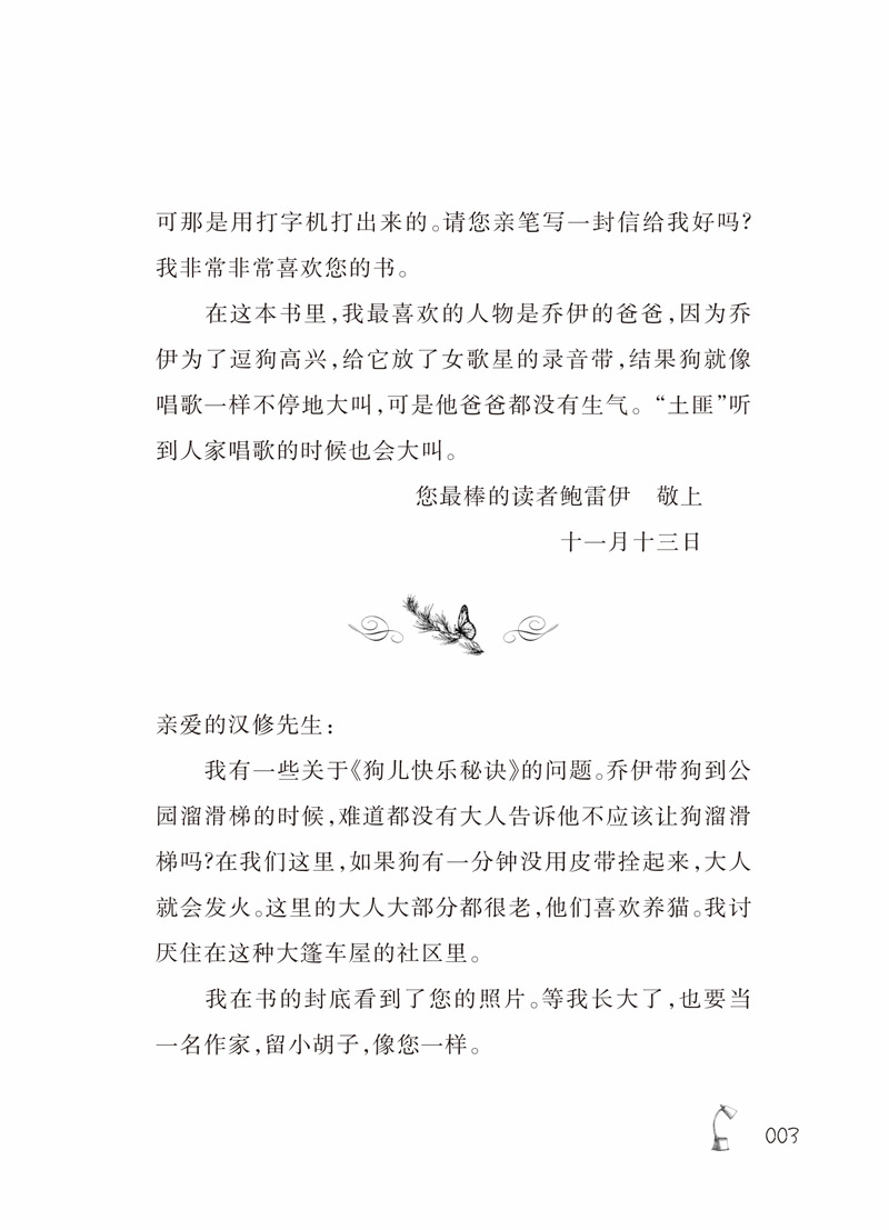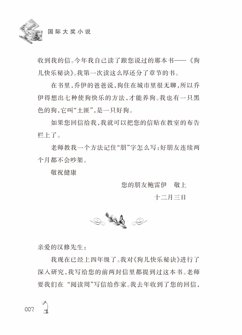 我去年给您写过一封信,那时我上二年级。您大概没收到我的信。今年我自己读了跟您说过的那本书——《狗儿快乐秘诀》。我第一次读这么厚的书,还分了章节。