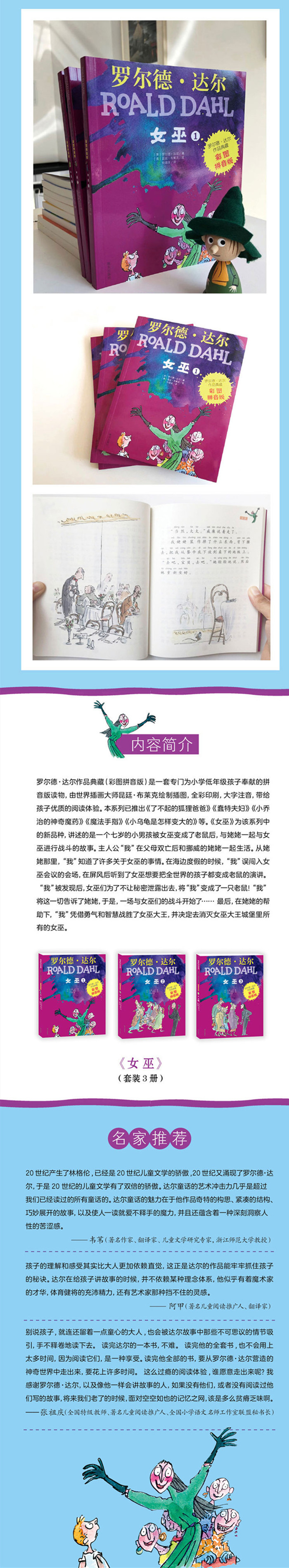 《女巫》讲述的是一个七岁的小男孩被女巫变成了老鼠后,与姥姥一起与女巫进行战斗的故事。主人公“我”在父母双亡后和挪威的姥姥一起生活。从姥姥那里,“我”知道了许多关于女巫的恐怖的事情。在海边度假的时候,“我”误闯入女巫会议的会场,在屏风后听到了女巫想要把全世界的孩子都变成老鼠的演讲。“我”被发现后,女巫们为了不让秘密泄露出去,将“我”变成了一只老鼠!“我”将这一切告诉了姥姥,于是,一场与女巫们的战斗开始了……*后,在姥姥的帮助下,“我”凭借勇气和智慧战胜了女巫大王,并决定去消灭女巫大王城堡里所有的女巫。