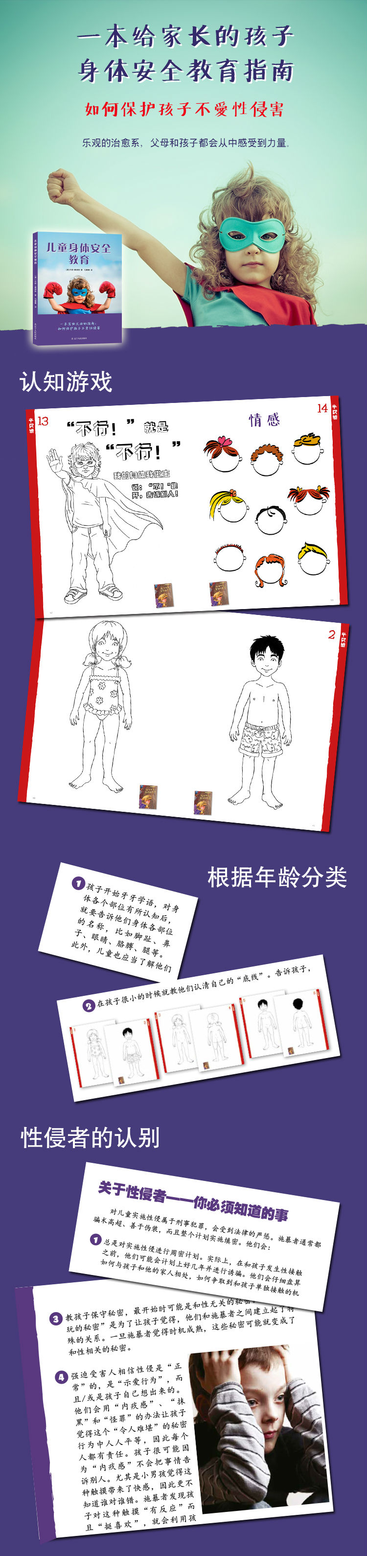 《儿童身体安全教育》通过指导父母对孩子进行身体安全教育,让父母和看护人学会如何保护孩子不受性侵害。《儿童身体安全教育》内容简单实用,并根据孩子的年龄进行了分类,而且还介绍了施暴者是如何诱骗孩子和家长的。