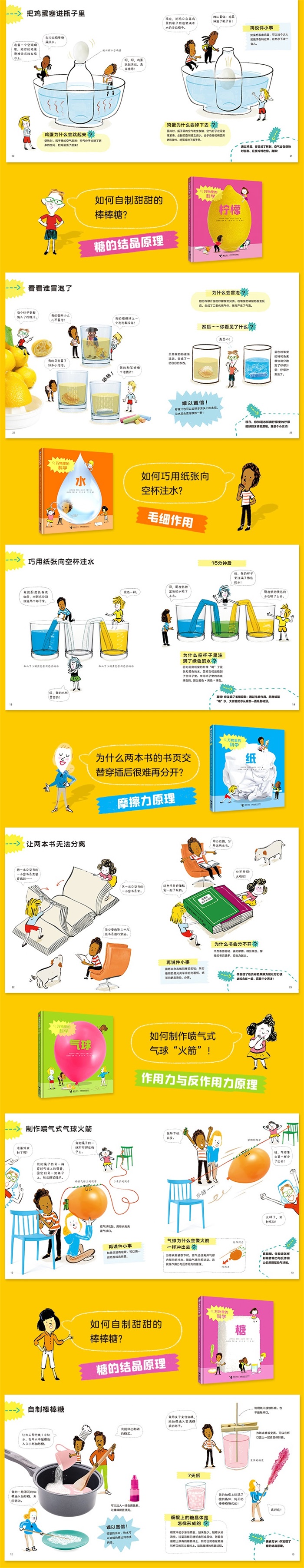 “万物里的科学”系列将丰富、专业的科普知识用生动、有趣的方式展示出来,激发孩子动手探索科学、揭秘科学的欲望,是一套能够拯救孩子于科学概念的科学启蒙读物。内容设计合理,每册书都由易到难,深浅适中,所以适读年龄很广,学龄前的孩子可以亲子共读,给零基础的孩子进行科学启蒙,并配之动手操作实验开启孩子的科学之旅,在获得科学经验的同时增进亲子感情;6 岁以上的孩子可以独立阅读,由浅入深,了解生活里常见事物中的科学秘密,萌发他们对身边事物的好奇心与探究欲,以兴趣使然、毫无压力的视角感受科学的魅力,产生探索世界的欲望。 ——中国科学院幼儿园教育集团总部教研中心主任 吴采红 “万物里的科学”是一套与小学科学课有着紧密联系的科学绘本,很适合作为小学科学课堂拓展延伸的科普读物。书中包括6 个主题:糖、柠檬、鸡蛋、纸、水、气球。这些内容对于学生来说并不陌生,是生活中常见的材料。书中围绕着某个主题所展开的多角度、不同类型的实验,从引导学生关注生活中的一个现象开始,但又没有停留在单个事物上,而是引导学生发现更多的生活现象,逐渐对事物形成整体认识。 ——北京市海淀区中关村第三小学科学学科骨干教师 付强