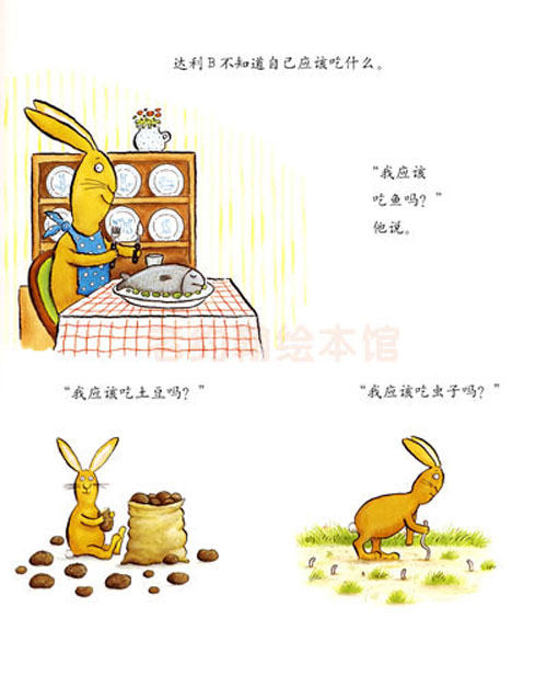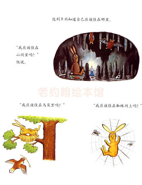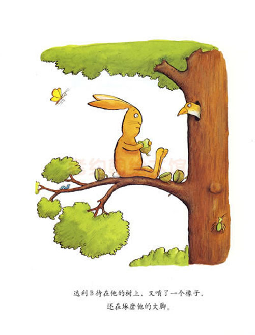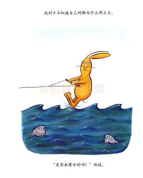 达利B有好多烦恼:他是谁?他应该住在哪里?他应该吃什么?他统统不知道!而让他更疑惑的是他为什么长了一双大脚。一天,树林里来了一只黄鼠狼洁西D,其他兔子都躲进了地洞,只有达利B还在树上傻乎乎地吃橡子。洁西D爬到树上说达利B是只兔子,正准备吃掉他,却被达利B的一双大脚给踢飞了。兔子们跑出来赞扬达利B是个英雄。这下,达利B更疑惑了:“真奇怪,我还以为我是一只兔子呢。”