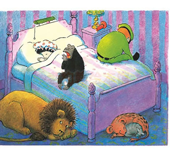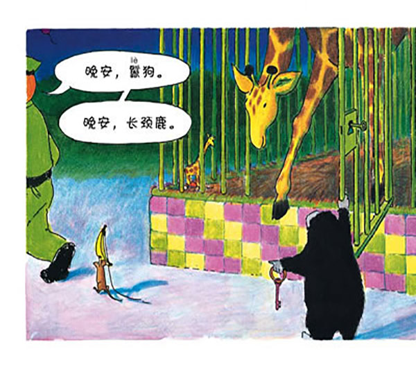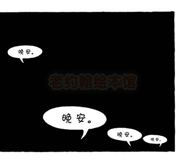 紧接着,一张开阔的图画映入眼帘,作者再次运用了跨页的图画效果。动物们蹑手蹑脚地跟着管理员回了家。从他们的表情上?们可以推断出,这是一件令人欢喜的事儿!在后面的长颈鹿甚至有点迫不及待。就在这时,作者就像端着一台照相机,将远景忽然拉近,动物们一一进了家。仔细看看这间小屋,墙上的照片我们依稀可以辨别出:有结婚照,(结婚的时候,管理员仍旧是那套衣服)一个女士正给一只小猩猩喂奶,甚至还有几只动物的照片!月光投射进来,祥和而幽美。小房间的灯还亮着,应该是等待未回家的人。“晚安,亲爱的。”真是最后一声晚安吗?——“晚安”“晚安”“晚安”“晚安”……女主人并没有惊讶地大叫,就像平常一样,穿着睡衣领着这些孩子回到了动物园,也?,这种情况已经不是第一次发生了。孩子也回去了吗?他睡着了吗?最后的晚安,是谁说的呢?