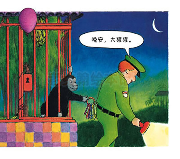 夜深人静,动物园的管理员去跟动物们一一道晚安。调皮的大猩猩拿走了他挂在身后的一串钥匙,从笼子里溜了出来,还偷偷放出了大象、狮子、长颈鹿……就这样,动物们悄悄地跟在管理员身后回了家……《晚安,大猩猩》全书文字并不多,但幽默耐读、温情脉脉,图画更是闪耀着一种宝石般的卡通色彩,整个故事就像是作者用浓浓的夜色与五彩缤纷的荧光粉画出的一个梦。活泼俏皮、栩栩如生的动物形象让人忍俊不禁;而气球、小老鼠、大香蕉等一系列精心设计、充满童真童趣的细节更是能让孩子们立刻融入其中。读完这个热闹又有趣的睡前故事,大人一定会和孩子们一起哈哈大笑!