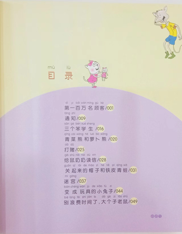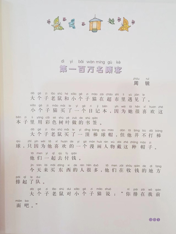 第一百万名顾客      大个子老鼠和小个子猫在超市里遇见了。   小个子猫买了一个日记本,因为她很喜欢这本子里用彩色树叶做的书签。   大个子老鼠买了一顶棒球帽,他不打棒球,因为漫画里他喜欢的一个人物戴这种帽子。   他们一起去付钱。   今天来买东西的人很多,收钱的地方排起了队。   大个子老鼠对小个子猫说:“你排在我前面吧。”   小个子猫问:“为什么?”   “女士优先嘛。”   付钱的队伍一点一点向前移动。   忽然跑来鸵鸟婆婆,她手里拿着一瓶酱油。   她对大家打招呼:“对不起,我烧鱼时发现没酱油了,赶紧跑来买酱油。跟大家商量一下,请让我先付钱吧,不然我那条鱼就要烧焦了。”   小个子猫说:“这不仅是鱼焦不焦的问题,弄不好还会引起火灾。”   为了鸵鸟婆婆和她邻居的房子不被点着,大家同意鸵鸟婆婆不排队先付钱。   鸵鸟婆婆说了“谢谢”付了钱,然后拿着酱油飞快地跑回去了。      付钱的队伍向前移动着。   走来一个肚子大大的猪女士,她手里攥着一样什么东西,脸上有点不好意思。