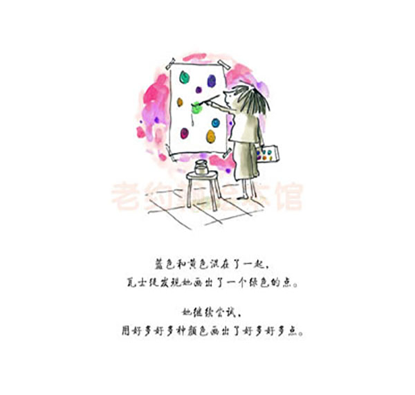 水彩晕染产生的简约色彩,单纯的如同孩子的世界,而正是这简约的色彩,却用不同色彩展示了瓦士缇的心情。如老师让她随便画一笔时,瓦士缇的周围是红色的水彩重重涂抺出的点,表达了小瓦士缇的愤怒、不屑一顾的心情;而老师让她签名的画面是浅黄色水彩晕染出的“点”,表达了瓦士缇的安定和小小的自信心;而当瓦士缇看到自己的最初的小小“点”被老师配上波浪形的画框后再画“点”的背景则是黄绿色、浅粉色、浅黄色的水彩晕染的点。作者独物的构思、简约的色彩与这个简单的故事相得益彰。