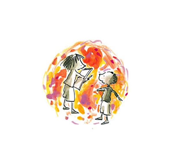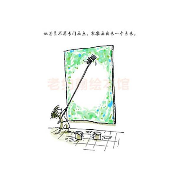 这本书的卦面是一个小女孩拿着一个巨大的画笔(绑在一个长长杆子上的大刷子)在画一个大大的橙黄色的点。这是一本构思奇特的书,一个微不足道的“点”,却是带领主人公瓦士缇走向绘画?界的起“点”,也是走向灵感世界的“点”,而这最大的功劳应该归功于瓦士缇的美术老师。