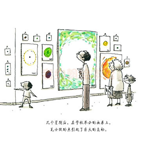 就是老师这看似不经意的装饰却给瓦士缇带来了极大的信心,让她打开了自己从来未打开的水彩盒,画起更多、更大的点,以至于最后在学校的画展上,?士缇的各种各样的点的画引起全校的轰动。