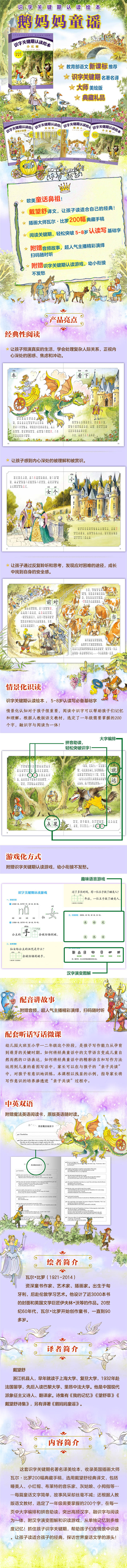 内容简介 这套识字关键期名著美绘本,在翻译泰斗任溶溶全新翻译下,狮子和老鼠、龟兔赛跑、熊和旅人、下金蛋的鹅、披着狮皮的驴、狼来了、城市老鼠和乡下老鼠……每篇童话文字简单,故事风采却丝毫不减;书中收录英国插画大师瓦尔?比罗200幅典藏手稿,生动细腻;还根据人教版语文教材,选定了一年级需要掌握的200个字,在每一页中大字编排和拼音助读,突出高频汉字,融识字与阅读为一体,附汉字演变图解和识读游戏,从单独记忆到多维度记忆!抓住孩子识字关键期,帮助孩子们在情景中识读,让孩子读适合孩子的名著经典!