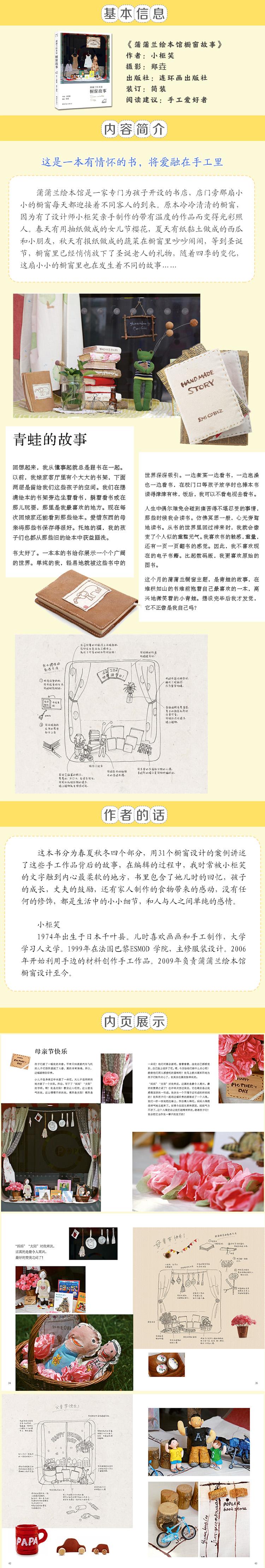 蒲蒲兰绘本馆橱窗故事》从策划,到拍摄,再到出版,历经两年多的时间。这期间我知道了生活在橱窗中的那些小东西们是如何诞生的。小柜笑告诉我,她心里住着一个小孩,这个小孩有很多很多故事,于是她就做出这些手工作品,让它们把故事讲给大家听,而手工制作的奇思妙想往往就藏在日常生活中,它时而产生于我们与亲朋好友不经意的对话中,时而又会从厨房清理出来的废旧用品里冒出来。损坏了的家具、家人的旧衣服、报纸、玻璃瓶、小石块、树枝、松球、乃至鲜花、树叶中都隐藏着不少的好点子。当然,堆满整个书架的绘本里更少不了。仔细想,原本冷冷清清的橱窗正是因为有了这些带有温度的手工作品,才变得可爱起来的啊。快看看你手边有哪些材料,一起来发现手工制作的乐趣吧!