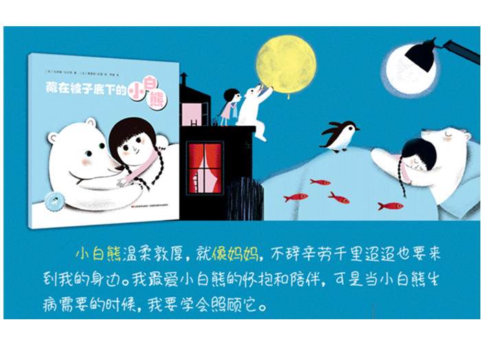《被子底下的故事》不仅仅是四个简单的睡前故事,每个动物更像是“我”们长大过程中*珍贵的四种陪伴。小白熊千里迢迢来到我的身边,它的温暖守护像极了不辞辛劳无怨无悔的妈妈;大袋鼠多才多艺,吹拉弹唱举高高,简直就是那个无所不能的爸爸;小老鼠古灵精怪,我们一起玩耍,一同经历,就像是身边一起长大的小伙伴们;老乌龟年事已高,虽然它慢慢吞吞可能跟不上我们玩耍的步伐,就像家里年长的爷爷奶奶,我们需要更加细心地陪伴和照顾它。