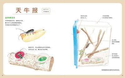 头顶着两根比身体还长的触角,拥有强而有力的大颚,看来一副凶恶样,这就是天牛。天牛的大颚是用来啃树皮、咬木头的;雌性的天牛还会用大颚在树干上挖洞,把宝宝产在里面。有些天牛还会吸花蜜呢。这些天牛的秘密生活,在《天牛》一书中作者都以写实的画风一笔笔地描绘出来,让我们有如亲临实境一般。