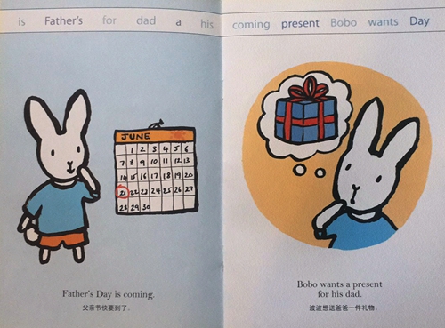 I'm- going- to- Read 分级阅读第二级Level2。中英双语,适合亲子共读或二三年级英语初学者自行阅读。小兔波波想要在父亲节送给爸爸一件礼物。它去找了好些朋友,最后动手做了一件漂亮的礼物送给爸爸。