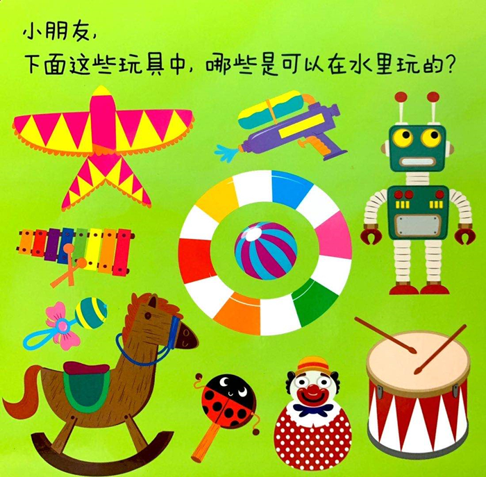 《小不点的滑板认知书:玩具》6个跨页,前五个跨页有和场景相关的认知物,并结合各种工艺,如拉拉、滑板等,让宝宝在动手玩的过程中,认知事物。第六个跨页为前五个跨页认知物的合集。