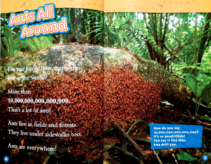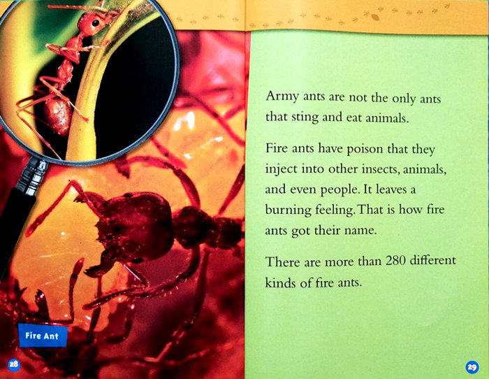 LEVEL 1为刚刚能够独立阅读的儿童准备,每页由一个或多个小段落组成,词汇和句子较为简单。对事物的描述较为详尽,比如描述蚂蚁:蚂蚁的数量,居住在哪里,身体构成,蚁穴的构造,搜集蚂蚁的专家,蚂蚁每天的生活,蚂蚁的种类,食物,作用等等。