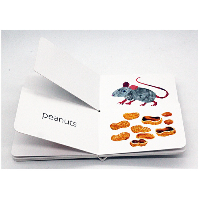 封面有很多可爱的食物。有苹果、小兔子最爱的胡萝卜还有黄橙橙的奶酪。让宝宝们看了忍不住食指大动。我们从上层挑出一种动物,让宝宝们在下层找到它所吃的食物,
