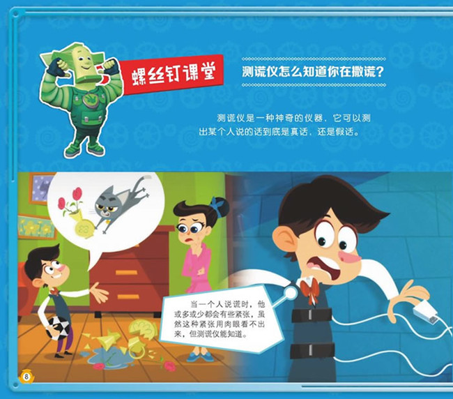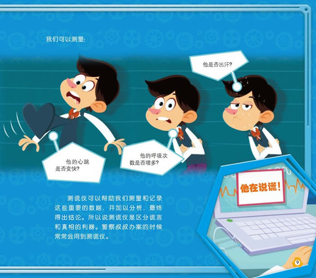 本书包括《别对我撒谎》、《驯狗小绝招》和《生气会传染》三个故事,讲述了测谎仪、连锁反应和反射的科学知识,引入了心理学的概念。《别对我撒谎》讲述了测谎仪的测谎原理,让孩子知道人的身体状况会反应出心理状况。《训狗小绝招》则讲述了条件反射和非条件反射的科学原理,并且详细讲了如何利用经典反射理论来训狗,非常有趣。《生气会传染》则讲述了人的心情好坏可以引起一系列变化,如果你生气,整个世界都会生气,如果你微笑,整个世界都会微笑……