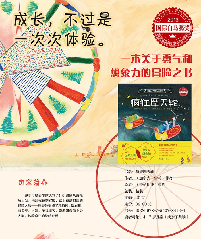 菲奇带领读者享受了一段美妙的摩天轮旅程,亚约天马行空的插画让这本书锦上添花。本书值得广大学校、图书馆和绘本馆拥有,强烈推荐!