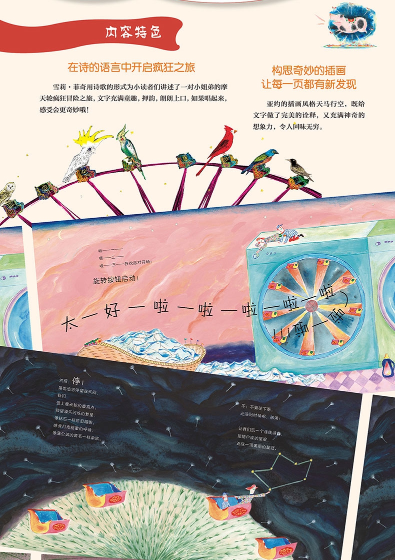 雪莉·菲奇用诗歌的形式为小读者们讲述了一对小姐弟的摩天轮疯狂冒险之旅,文字充满童趣,押韵,朗朗上口,如果唱起来,感受会更奇妙哦!