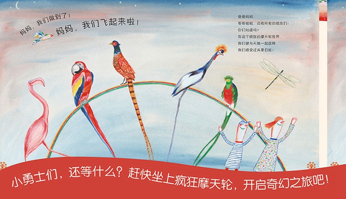 一本充满想象力的诗歌绘本。文字作者是加拿大优秀的诗歌作家,所以在行文风格上以节奏感很强的诗歌句式来呈现。通过色彩鲜艳的插图,给小读者们展现了一幅幅神秘的又精彩的以摩天轮为主体的想象世界。想象在坐上摩天轮,吃云彩棉花糖,连线天上的星座,感受月亮的呼吸,在海上扬帆等等奇幻冒险。一切都被赋予了生命,又是那么新奇和刺激,终于和天空融为一体。全书完美地展示了孩子心中大人所不能及的精彩的幻想世界。
